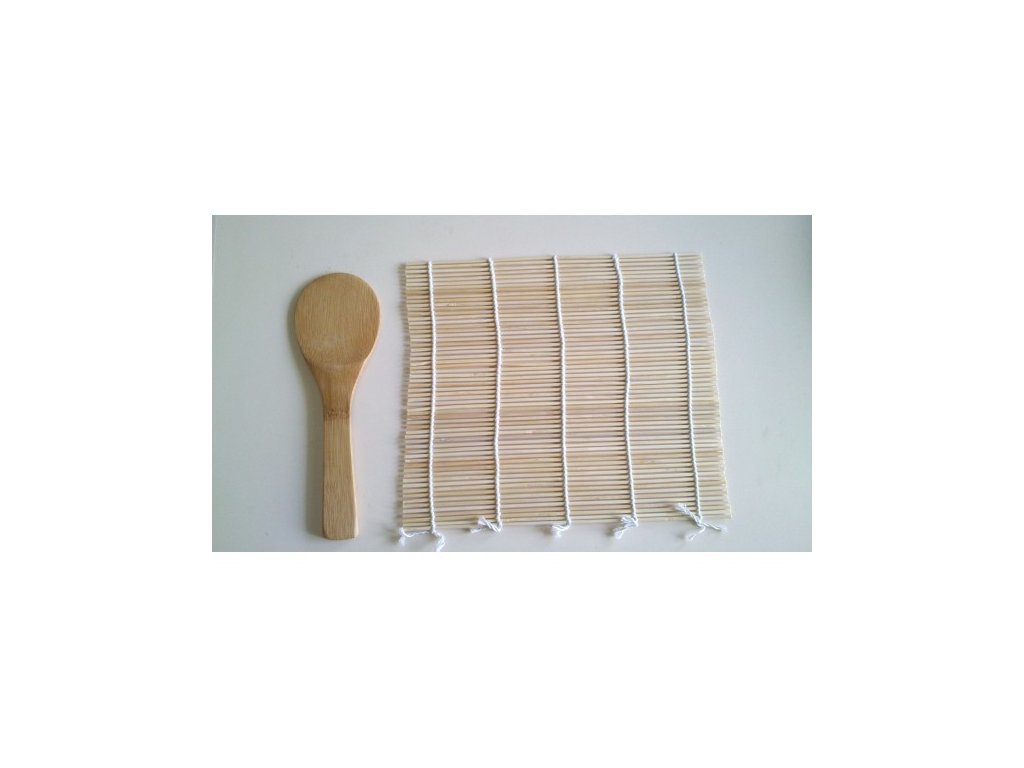 Rolovací podložka na sushi a dřevěná lžíce na promíchání rýže s octem. Bez podložky se milovník sushi rozhodně neobejde. Podložka vám usnadní motání rolek. Na podložku položte řasu Nori, překryjte ji rýží, oblíbenou zeleninou nebo rybami a zarolujte.