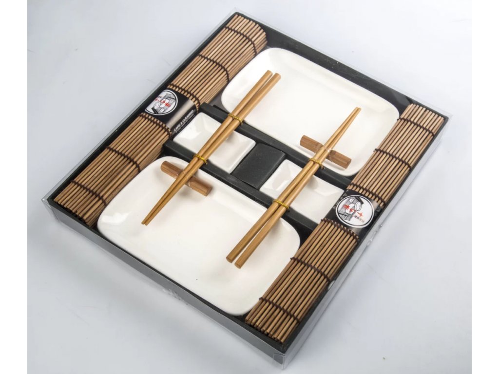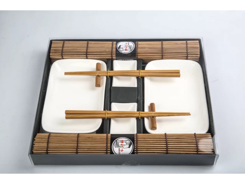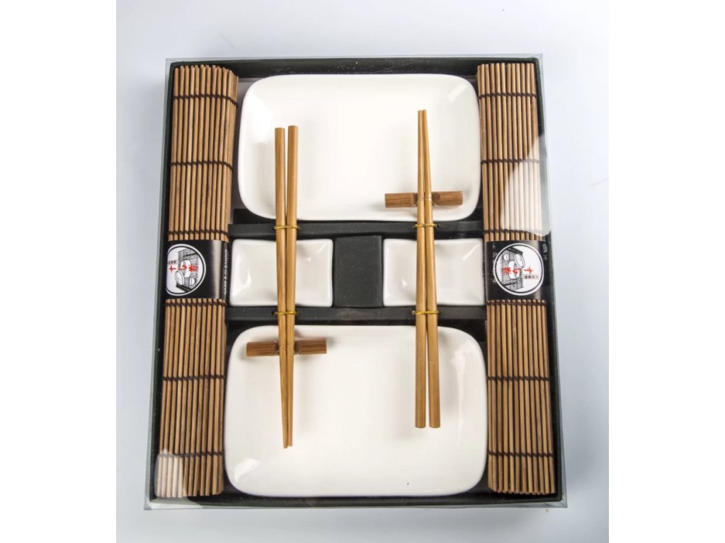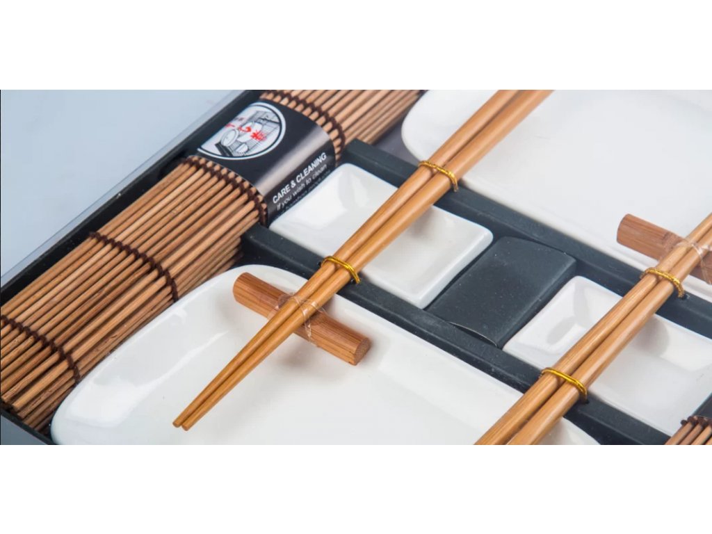 V dárkovém setu na sushi pro dva najdete porcelánové misky pro sushi rolky, mističky pro omáčku nebo wasabi, hůlky a prostírání. Nyní stačí jen vše připravit a popřát Itadakimasu